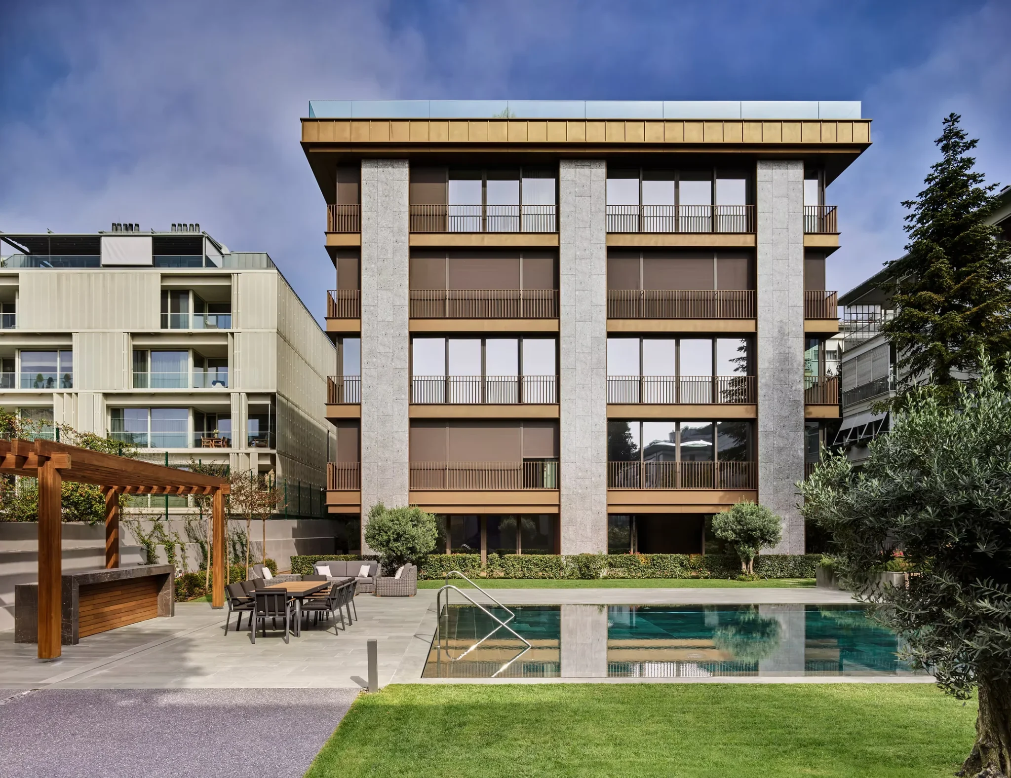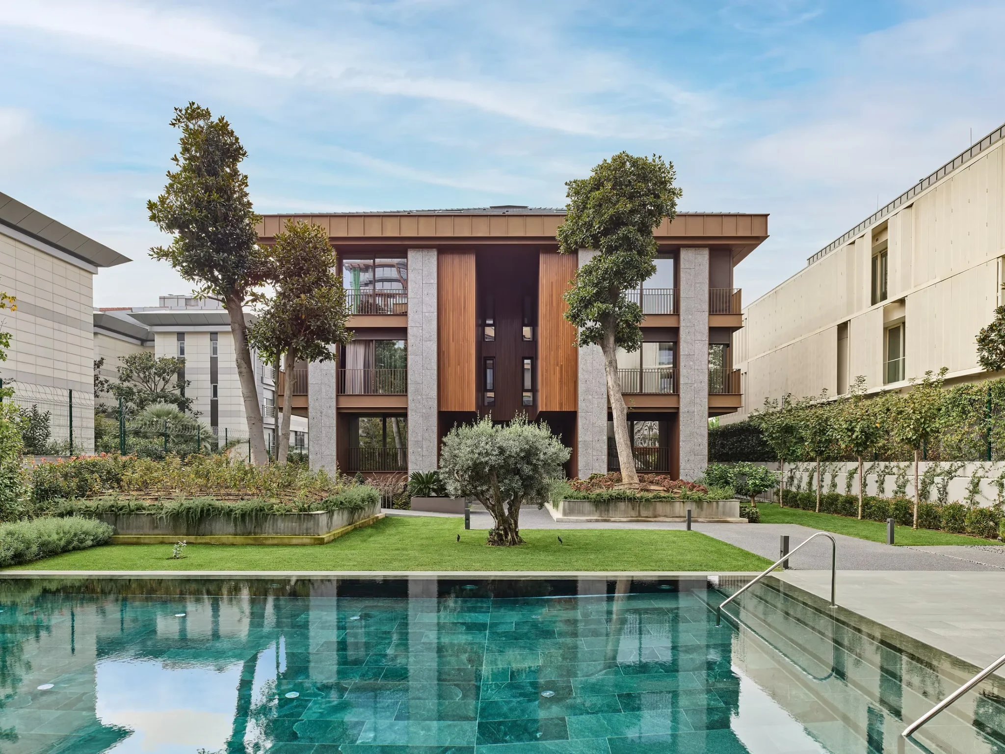 In the pool area of Suadiye Tekinalp Residences, approximately 250 m² of Alanya Green Diabase was used.